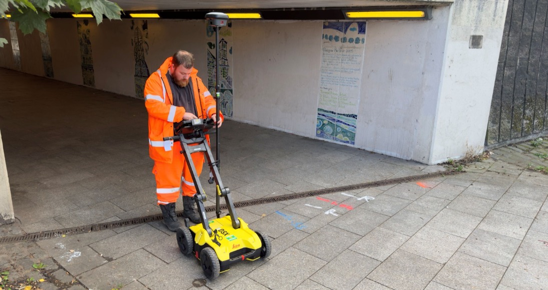 The survey consisted of lifting all manholes and inspection covers to mark depths and directions, along with sub-surface services located and mapped using EML (electromagnetic locating) with a CAT and genny, and GPR (ground penetrating RADAR).